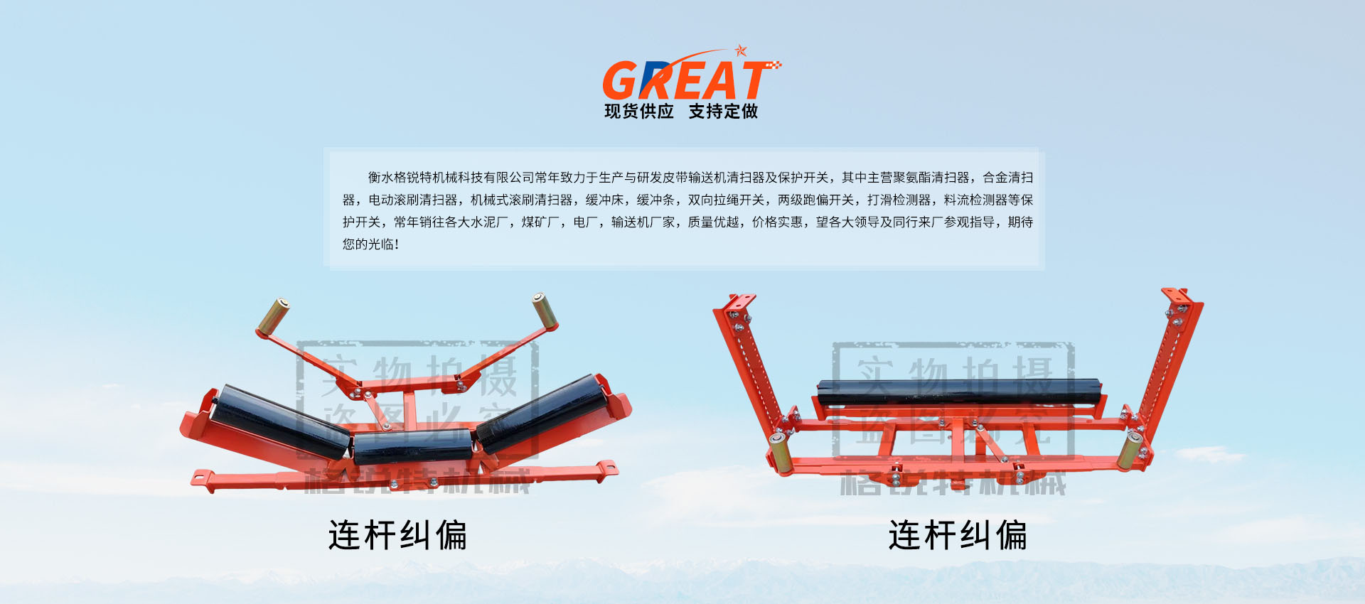 衡水格銳特機(jī)械科技有限公司常年致力于生產(chǎn)與研發(fā)皮帶輸送機(jī)清掃器及保護(hù)開關(guān),其中主營聚氨酯清掃器,合金清掃器,電動(dòng)滾刷清掃器,機(jī)械式滾刷清掃器,緩沖床,緩沖條,雙向拉繩開關(guān),兩級跑偏開關(guān),打滑檢測器,料流檢測器等保護(hù)開關(guān),常年銷往各大水泥廠,煤礦廠,電廠,輸送機(jī)廠家,質(zhì)量優(yōu)越,價(jià)格實(shí)惠,望各大領(lǐng)導(dǎo)及同行來廠參觀指導(dǎo),期待您的光臨!!!